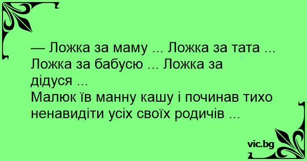 — Ложка за маму ... Ложка за тата ... Ложка за бабусю ... Ложка за дідуся ...