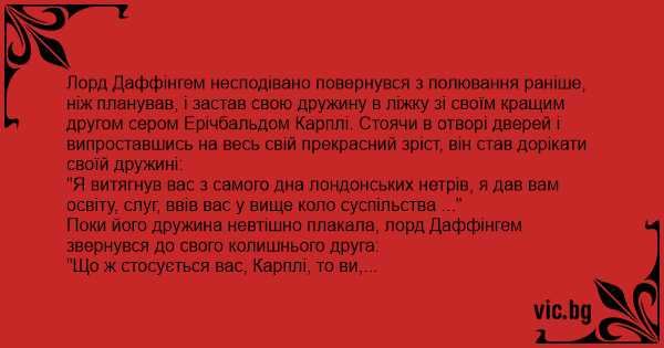 Лорд Даффінгем несподівано повернувся з полювання раніше, ніж планував, і застав свою дружину в ліжку зі своїм кращим другом сером Ерічбальдом Карплі. Стоячи в отворі дверей і випроставшись на весь свій прекрасний зріст, він став дорікати своїй дружині:
