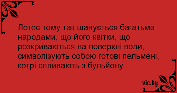 Лотос тому так шанується багатьма народами, що його квітки, що розкриваються на поверхні води, символізують собою готові пельмені, котрі спливають з бульйону.
