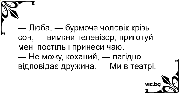 — Люба, — бурмоче чоловік крізь сон, — вимкни телевізор, приготуй мені постіль і принеси чаю.
