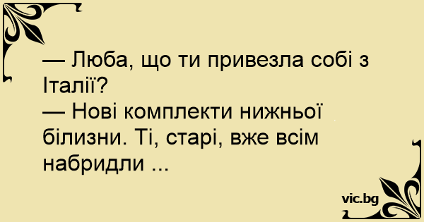 — Нові комплекти нижньої білизни. Ті, старі, вже всім набридли ...