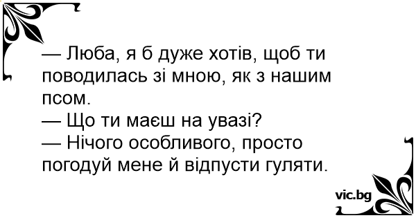 — Люба, я б дуже хотів, щоб ти поводилась зі мною, як з нашим псом.