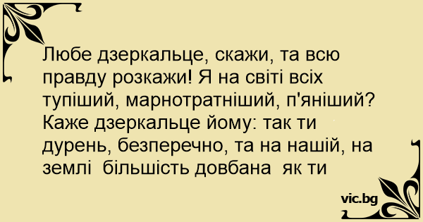 Любе дзеркальце, скажи, та всю правду розкажи! Я на світі всіх тупіший, марнотратніший, п'яніший?