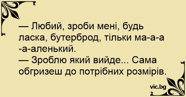— Любий, зроби мені, будь ласка, бутерброд, тільки ма-а-а-а-аленький.