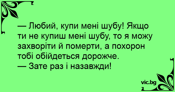 — Любий, купи мені шубу! Якщо ти не купиш мені шубу, то я можу захворіти й померти, а похорон тобі обійдеться дорожче.