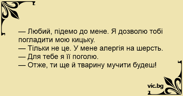 — Любий, підемо до мене. Я дозволю тобі погладити мою кицьку.