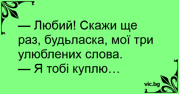 — Любий! Скажи ще раз, будьласка, мої три улюблених слова.