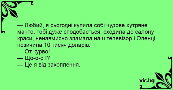— Любий, я сьогодні купила собі чудове хутряне манто, тобі дуже сподобається, сходила до салону краси, ненавмисно зламала наш телевізор і Оленці позичила 10 тисяч доларів.