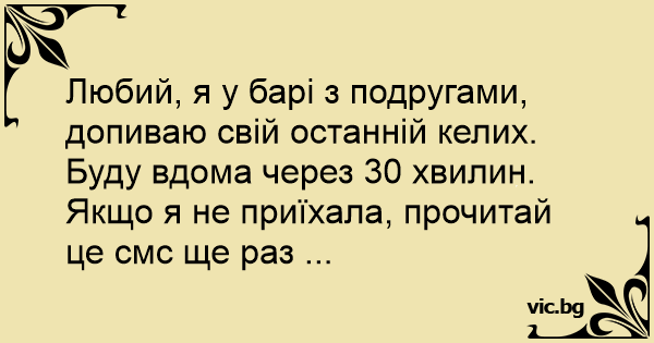 Любий, я у барі з подругами, допиваю свій останній келих. Буду вдома через 30 хвилин. Якщо я не приїхала, прочитай це смс ще раз ...