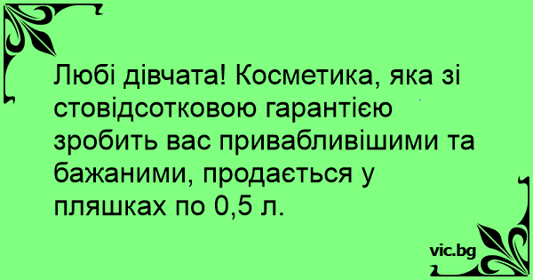 Любі дівчата! Косметика, яка зі стовідсотковою гарантією зробить вас привабливішими та бажаними, продається у пляшках по 0,5 л.
