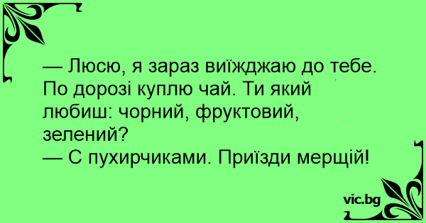 — Люсю, я зараз виїжджаю до тебе. По дорозі куплю чай. Ти який любиш: чорний, фруктовий, зелений?