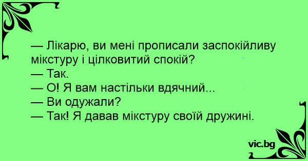 — Лікарю, ви мені прописали заспокійливу мікстуру і цілковитий спокій?
