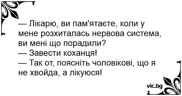 — Лікарю, ви пам'ятаєте, коли у мене розхиталась нервова система, ви мені що порадили?