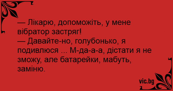 — Лікарю, допоможіть, у мене вібратор застряг!