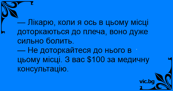 — Лікарю, коли я ось в цьому місці доторкаються до плеча, воно дуже сильно болить.