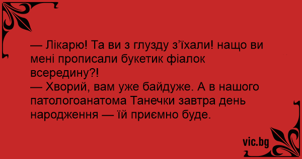 — Хворий, вам уже байдуже. А в нашого патологоанатома Танечки завтра день народження — їй приємно буде.