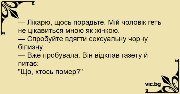 — Лікарю, щось порадьте. Мій чоловік геть не цікавиться мною як жінкою.