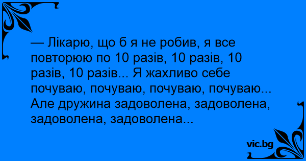 — Лікарю, що б я не робив, я все повторюю по 10 разів, 10 разів, 10 разів, 10 разів... Я жахливо себе почуваю, почуваю, почуваю, почуваю... Але дружина задоволена, задоволена, задоволена, задоволена...