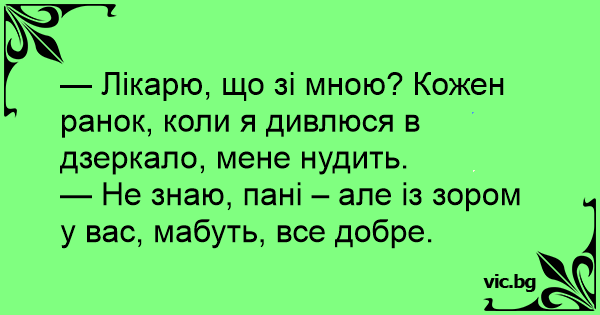 — Лікарю, що зі мною? Кожен ранок, коли я дивлюся в дзеркало, мене нудить.