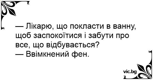 — Лікарю, що покласти в ванну, щоб заспокоїтися і забути про все, що відбувається?
