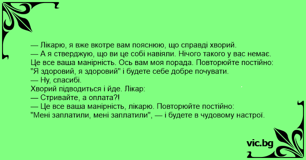 — Лікарю, я вже вкотре вам пояснюю, що справді хворий.