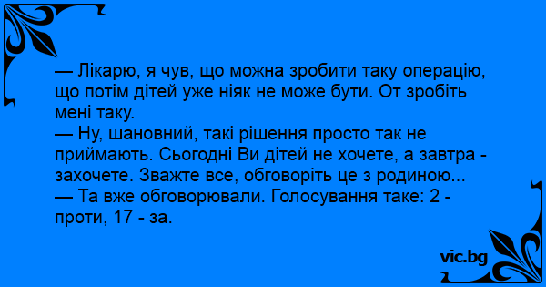 — Лікарю, я чув, що можна зробити таку операцію, що потім дітей уже ніяк не може бути. От зробіть мені таку.