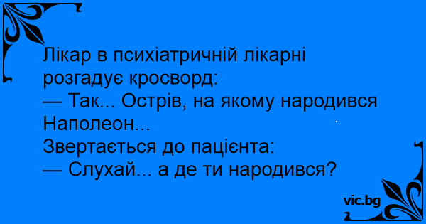 Лікар в психіатричній лікарні розгадує кросворд: — Так... Острів, на якому народився Наполеон... Звертається до пацієнта: — Слухай... а де ти народився?