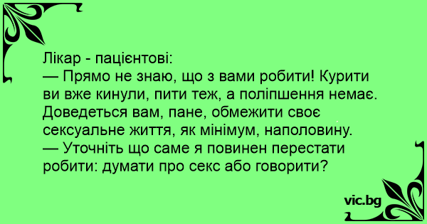 — Прямо не знаю, що з вами робити! Курити ви вже кинули, пити теж, а поліпшення немає. Доведеться вам, пане, обмежити своє сексуальне життя, як мінімум, наполовину.