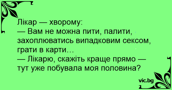 — Лікарю, скажіть краще прямо — тут уже побувала моя половина?