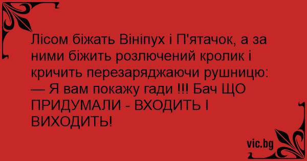 Лісом біжать Вініпух і П'ятачок, а за ними біжить розлючений кролик і кричить перезаряджаючи рушницю: