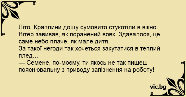 Літо. Краплини дощу сумовито стукотіли в вікно. Вітер завивав, як поранений вовк. Здавалося, це саме небо плаче, як мале дитя.