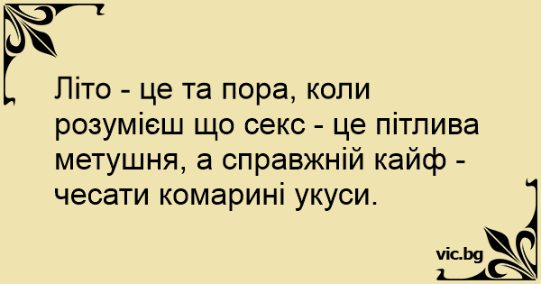 Літо - це та пора, коли розумієш що cekc - це пітлива метушня, а справжній кайф - чесати комарині укуси.
