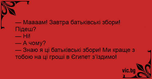 — Знаю я ці батьківські збори! Ми краще з тобою на ці гроші в Єгипет з’їздимо!