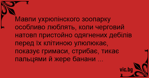 Мавпи ухрюпінского зоопарку особливо люблять, коли черговий натовп пристойно одягнених дебілів перед їх клітиною улюлюкає, показує гримаси, стрибає, тикає пальцями й жере банани ...