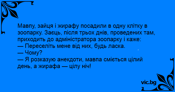 — Я розказую анекдоти, мавпа сміється цілий день, а жирафа — цілу ніч!