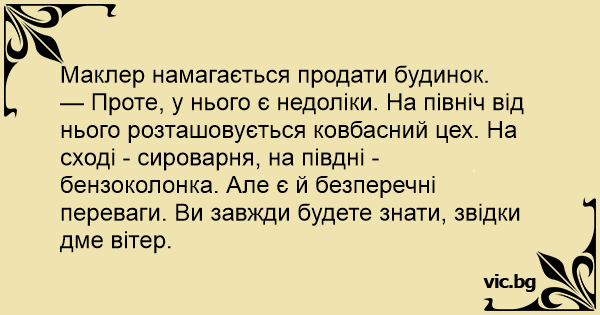 — Проте, у нього є недоліки. На північ від нього розташовується ковбасний цех. На сході - сироварня, на півдні - бензоколонка. Але є й безперечні переваги. Ви завжди будете знати, звідки дме вітер.