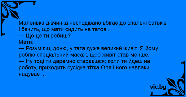 — Розумієш, доню, у тата дуже великий живіт. Я йому роблю спеціальний масаж, щоб живіт став менше.