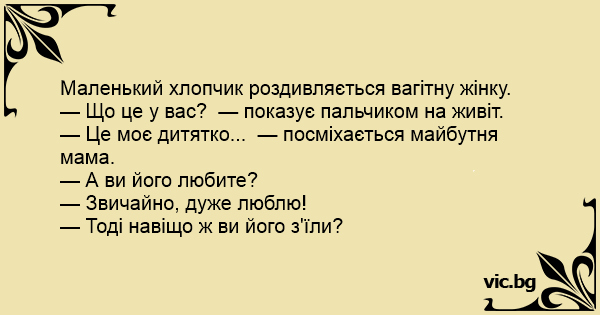 - Teta, o kodėl jūsų toks pilvas didelis? - Nes ten vaikas. - O jūs ji mylit? - Taip, labai! - O tai kodėl jūs jį suvalgėt?