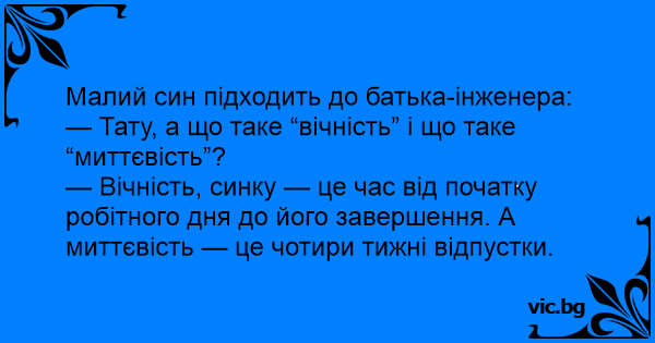 — Вічність, синку — це час від початку робітного дня до його завершення. А миттєвість — це чотири тижні відпустки.