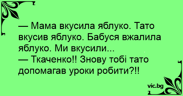 — Мама вкусила яблуко. Тато вкусив яблуко. Бабуся вжалила яблуко. Ми вкусили...