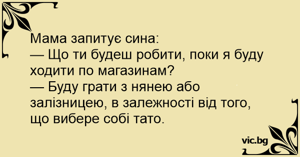 Māte jautā dēlam: “Ko Tu darīsi, kamēr es būšu projām?” - “Spēlēšos ar aukli vai ar spēļu dzelzceļu. Tas ir atkarīgs no tā, ko sev izvēlēsies tētis”.