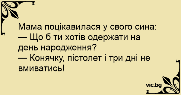 Мама поцікавилася у свого сина: — Що б ти хотів одержати на день народження? — Конячку, пістолет і три дні не вмиватись!
