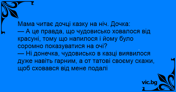 — Ні донечка, чудовисько в казці виявилося дуже навіть гарним, а от татові своєму скажи, щоб сховався від мене подалі