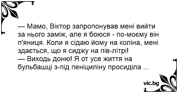 — Мамо, Віктор запропонував мені вийти за нього заміж, але я боюся - по-моєму він п'яниця. Коли я сідаю йому на коліна, мені здається, що я сиджу на пів-літрі!