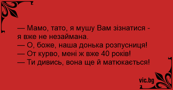 — Мамо, тато, я мушу Вам зізнатися - я вже не незаймана.