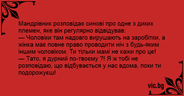 — Чоловіки там надовго вирушають на заробітки, а жінка має повне право проводити ніч з будь-яким іншим чоловіком. Ти тільки мамі не кажи про це!