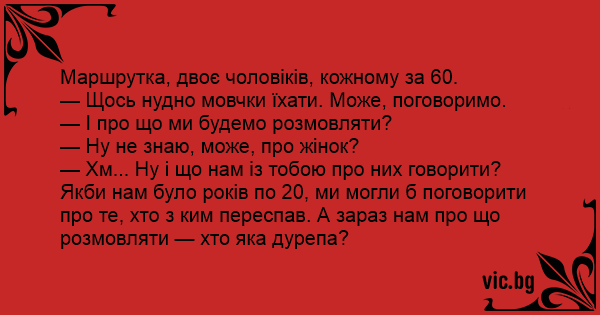 — Хм... Ну і що нам із тобою про них говорити? Якби нам було років по 20, ми могли б поговорити про те, хто з ким переспав. А зараз нам про що розмовляти — хто яка дурепа?