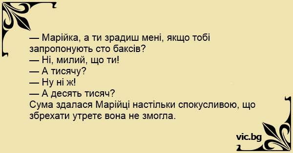— Марійка, а ти зрадиш мені, якщо тобі запропонують сто баксів?