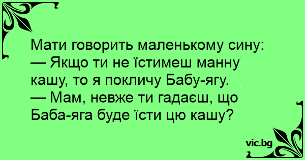 — Мам, невже ти гадаєш, що Баба-яга буде їсти цю кашу?