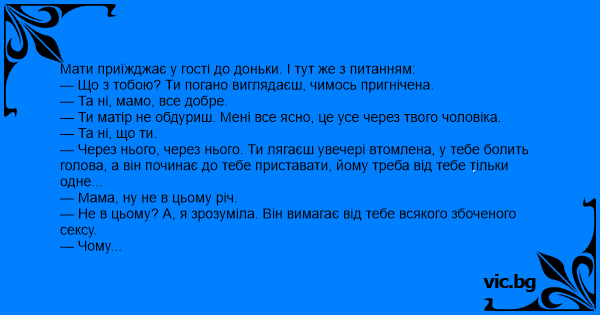 — Ти матір не обдуриш. Мені все ясно, це усе через твого чоловіка.